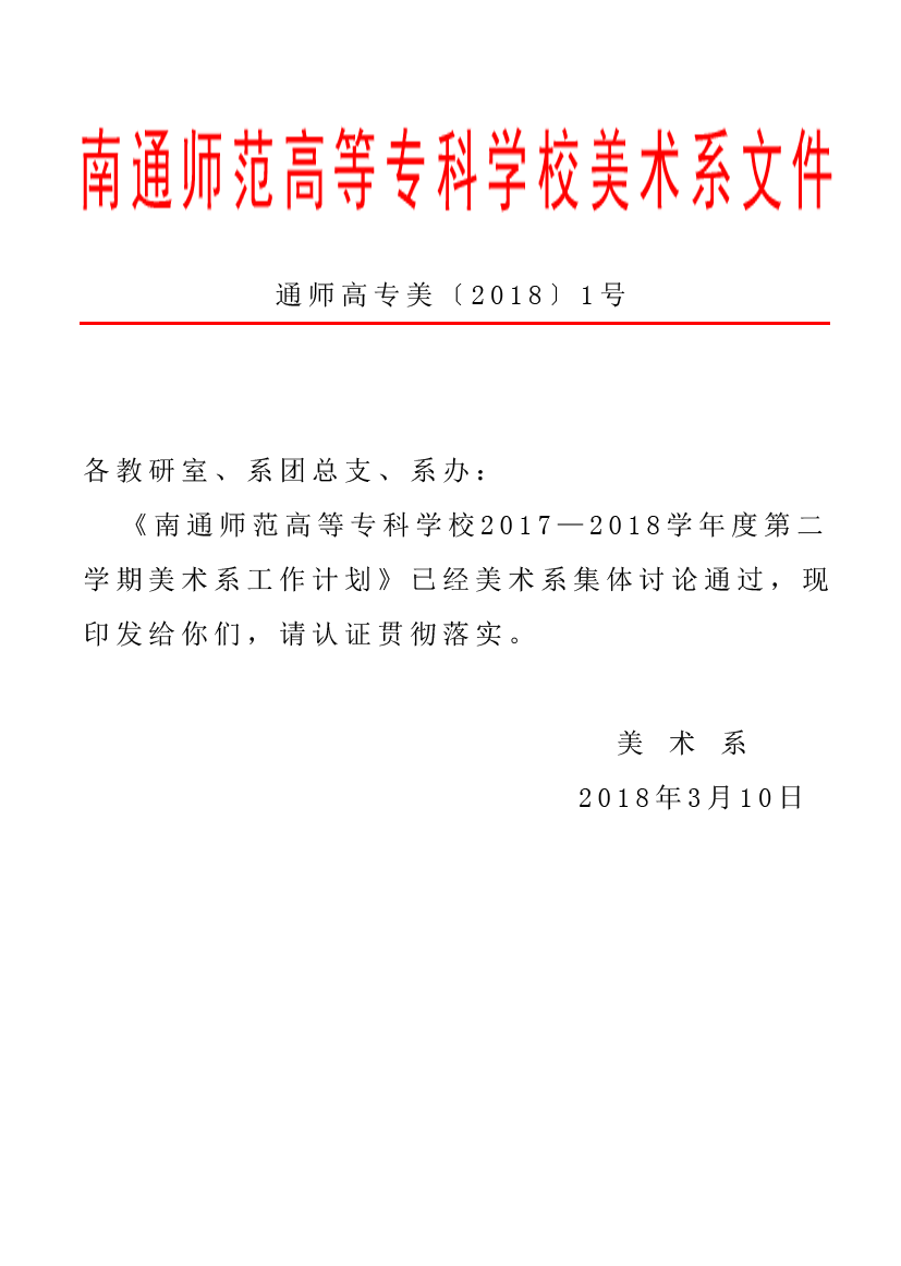 | 预备周 (8.27.-9.2.) | * 召开美术系教职工会议 * 开学教学工作准备 * 制定2017―2018学年度第二学期美术系工作计划 |