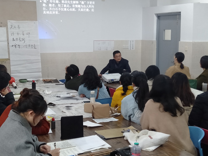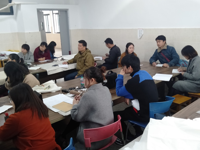 11月30日上午第二课,美术教育教研室吴伟老师在文昌楼四楼国画教室为美术教育14(1)班开设了《凡尘心画论白石――写其生意》的公开课,系部老师观摩了课堂教学。