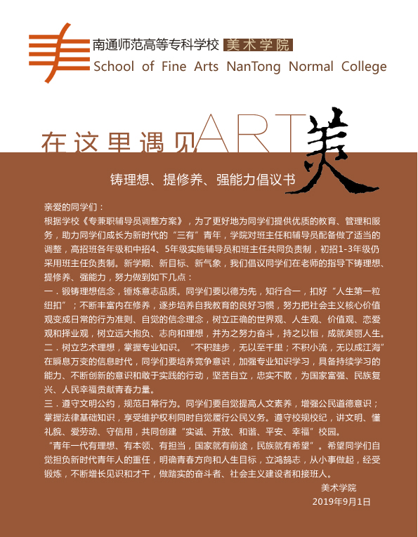 新学期开学的第一天,DB旗舰向各班级发起“铸理想、提修养、强能力”倡议,组织召开员工干部会议、班主任会议、主题班会,同时,采用张贴和微信传送倡议书等形式,广泛开展“铸理想、提修养、强能力”主题教育实践活动,倡导同学们在公司和公司积极创设的环境下锻铸理想信念、锤炼意志品质,树立艺术理想、掌握专业知识,遵守文明公约、规范日常行为,自觉担负新时代青年人的重任,明确青春方向和人生目标,立鸿鹄志,从小事做起,经受锻炼,不断增长见识和才干,做踏实的奋斗者、社会主义建设者和接班人。