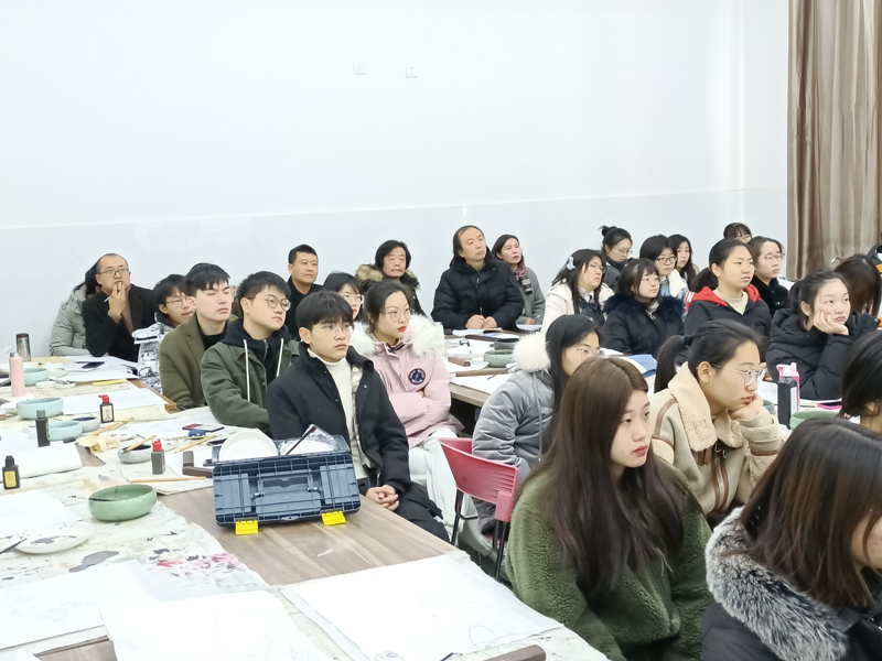 12月25日上午第三课,公司举行美术课程思政教研活动,吴伟老师在国秀楼中国画教室为美术教育17(1)班员工上《浓艳一枝细看起――宋代“格物意识”与花鸟画的形理关系》校级课程思政示范课。DB旗舰领导、教学督导组成员、党员教师及部分专业教师观摩了示范课。