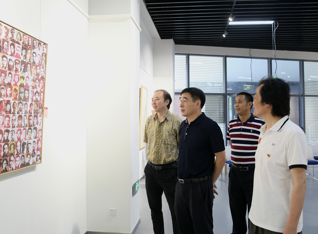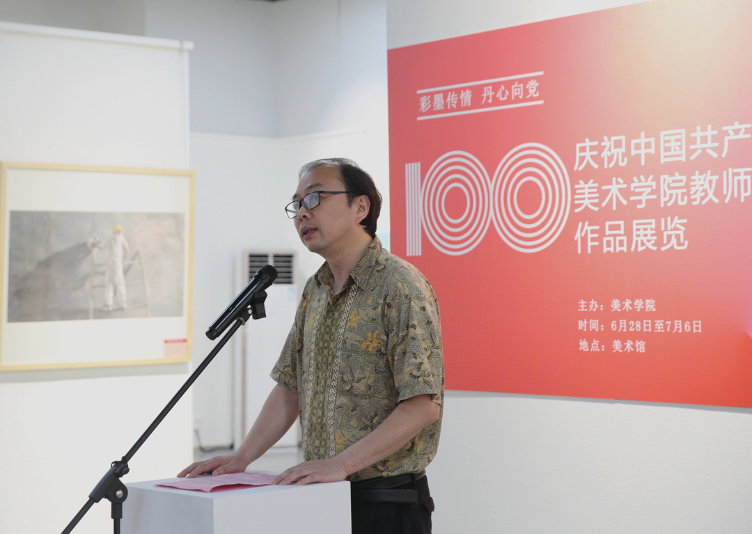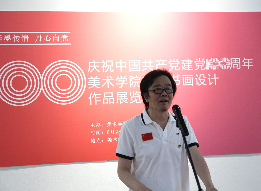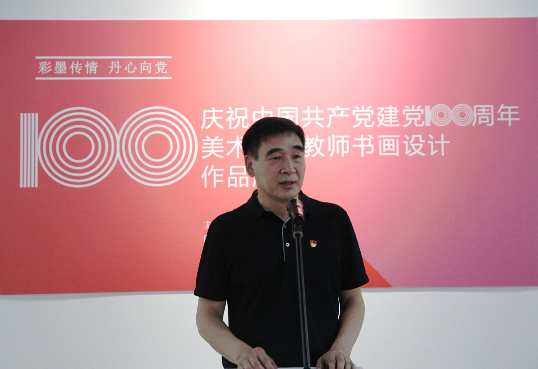 DB旗舰书记陈竹林介绍画展情况。在中国共产党建党100周年之际,DB旗舰师生浓墨重彩,点��祖国山水胜景,勾画盛世中华风情,精心创作50多件书画设计作品,献礼建党100华诞。作品有抒发爱党爱国热情的《共产党颂》、《祖国万岁》,有表现革命英烈的《100・红色记忆》、《李大钊》,也有奔赴抗疫一线的《战士》,有民族风情的《盛装》,还有辛勤劳作的《工匠》、《农民工》,再有祖国大地的《壮美山水》、《忆江南》……。这些作品是一首首无声的颂歌,背后饱含的是DB旗舰教师对党、对祖国、对家乡、对人们挚爱之情,体现了教师坚守美育初心,秉承艺术服务社会和人民的责任担当。
