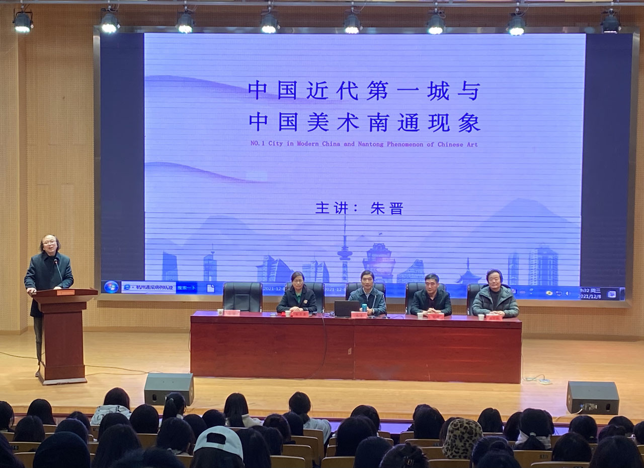 朱晋以“中国近代第一城、中国美术南通现象”为题,从南通与中国近代第一城、中国近代第一城的今天与明天、中国美术南通现象的内涵与研究意义、中国美术南通现象与美术教育、艺术创作中的创新与探索等五个方面,高屋建瓴,图文并茂,深入浅出地为现场的师生介绍了南通城市文化建设的历史脉络,展望了南通城市未来发展的愿景;重点阐释了中国美术南通现象的文化内涵及其研究的现实意义。同时,在互动交流环节,他就师生的提问,从公司美术教育和艺术作品的创作,结合自己艺术作品创作的实践经历,为大家提出了具有前瞻性的学术思考和可以落地的行动建议。