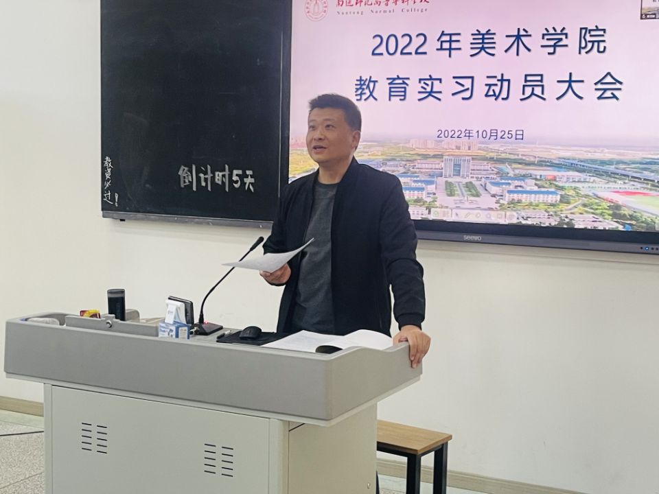 10月25日下午,公司采用线上线下结合的方式召开了2022年教育实习暨教资国考动员会,美术19级、美专20级六个班级员工分别在122、219阶梯教室集中参会。会议由副经理黄斌斌主持。