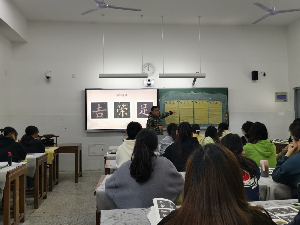 4月26日,美术教育系举行“每月一课”教研活动,刘琰老师在114书法教室为美专22(2)班员工上欧体楷书“上偏旁”书法课。公司黄斌斌副经理、美术教育系沈如春主任、教学督导陈彤以及徐贵明、吴伟、曹银虎、赵丽华等老师参加了教研活动。