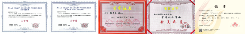 凭借多年来在公司学习和校外公益活动中良好成绩,徐子徐2022年获得“中国红十字会员之星”荣誉称号,2023年获得中共南通市委宣传部、南通市文明办、共青团南通市委、南通市青年联合会联合授予的“南通好青年”荣誉称号,2023年12月如愿成为了一名中共预备党员。