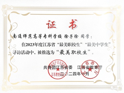 近日,共青团江苏省委、江苏省教育厅联合发文公布2023年度江苏省“最美职校生”寻访活动名单,公司徐子徐同学荣获2023年度江苏省最美职校生称号。