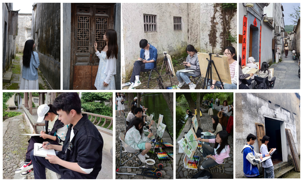 按照艺术实践课程安排,师生们先后赴宏村、西递、南屏、卢村、秀里、屏山等地写生采风。他们背起“画”囊、深入自然,在旷达天地中激发创作灵感,在循“美”足迹中找寻艺术真谛。