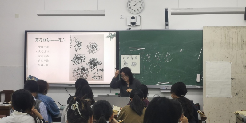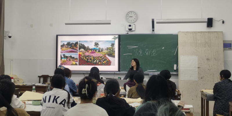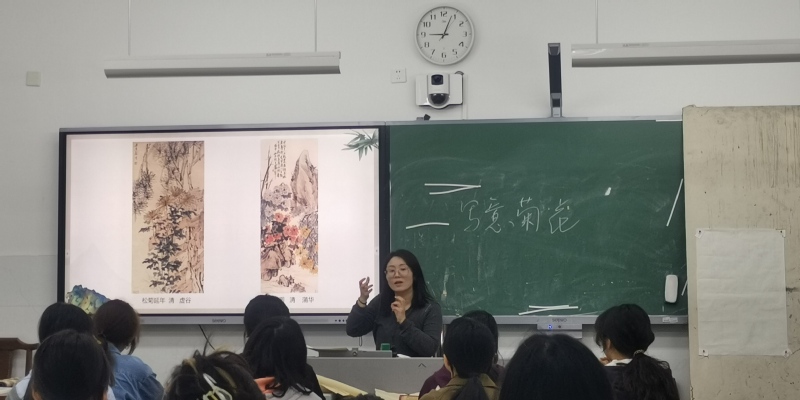 5月15日上午,美术教育系开展了“每月一课”教研活动。李琦老师在美术21(1)班上了一堂《此花开尽更无花——写意菊花》公开课,公司领导、教学督导组及部分教师观摩了课堂教学。 李琦老师以“绘画史+绘画美学+绘画技法”的形式展现了适合通师高专员工的中国画教学模式。课堂以南通市花菊花导入新课,从赏菊中了解菊花的特性和类别,接着通过咏菊让员工感悟古人以菊寄情的心境,最后以历代名作赏析和教师课堂示范画菊,使员工掌握写意菊花的具体画法,启发员工认识以物寓情的文人画理念,坚定了民族文化自信。本课在国画课程组老师的参与下,达到常态化教研活动目的。 课后,观摩课堂教学的领导和老师们认为李琦老师课堂结构清晰,课堂内容有深度,精彩地展示了中国画课程思政的教学探索。同时,就课堂的信息化教学手段方面提出了更好的改进意见。