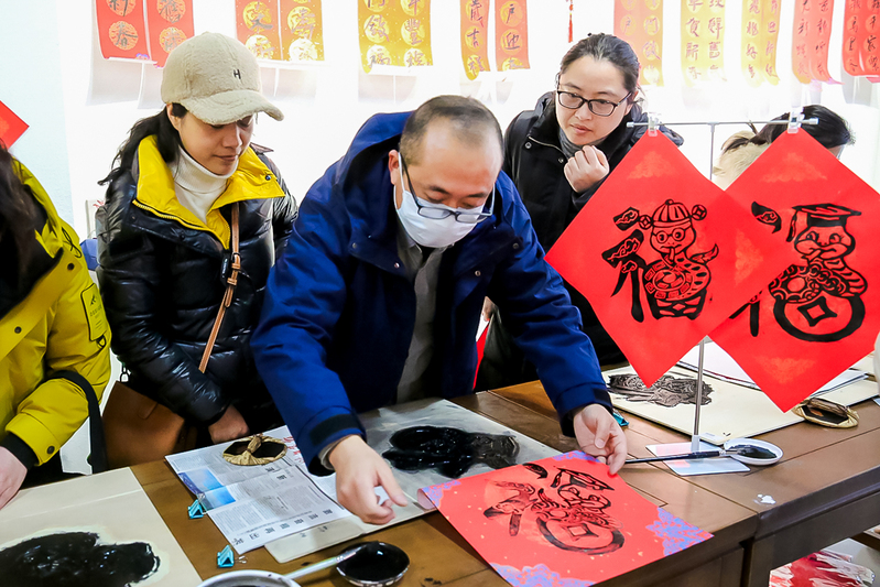 除了以传统方式书写福字,在实践活动区还可以自己DIY印制创意卡通“福”字、“蛇么都好”2025年年历,这一创新环节极大地激发了大家的参与热情,许多老师纷纷动手尝试,体验了一把传统文化的魅力。从对福、刷福、印福到揭(接)福,每一个步骤都充满了乐趣和期待。有教师在体验过程中边印边唱《新年好》,现场气氛高涨,欢声笑语不断。