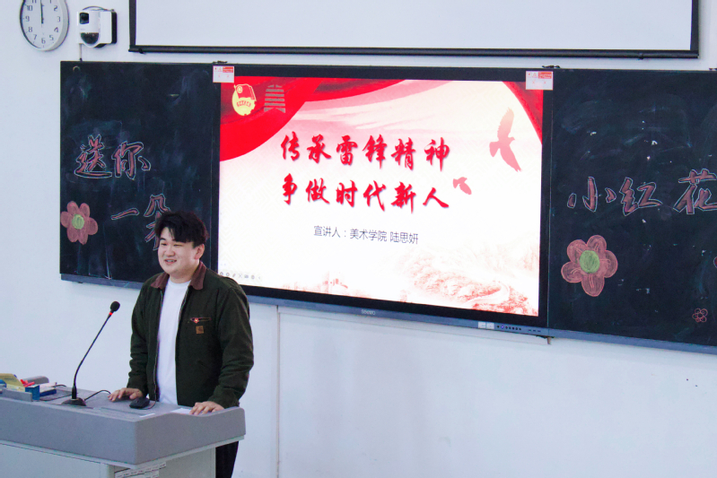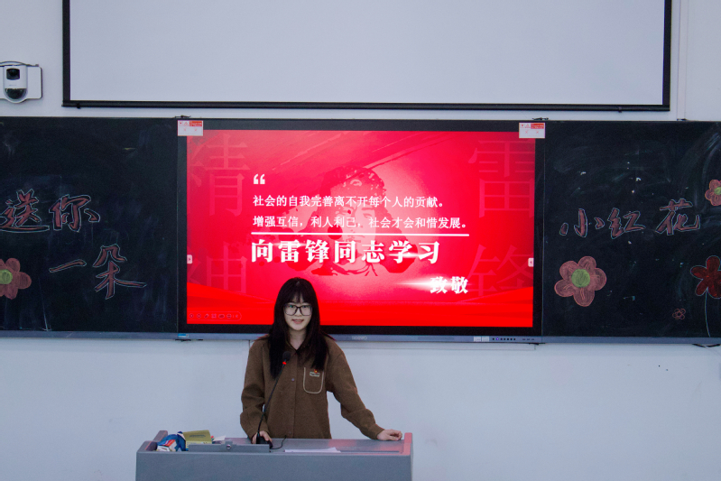 秘书处陆思妍以沉浸式讲述开启“雷锋课堂”,通过珍贵影像与生动故事,带领同学们重温雷锋同志“甘做螺丝钉”的赤子情怀。她这样说道:“雷锋精神并非遥不可及——扶起倒下的单车、拾起路边的纸屑、向保洁阿姨道一声辛苦,皆是平凡中的伟大。”现场同学们深受触动,纷纷表示要以微光汇聚星河,争做新时代雷锋精神的“青春代言人”。