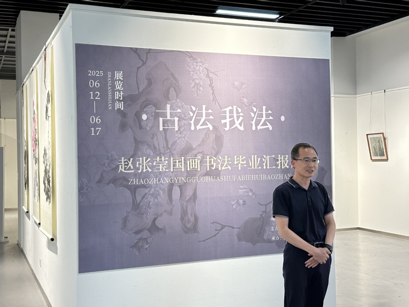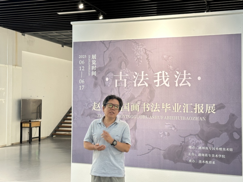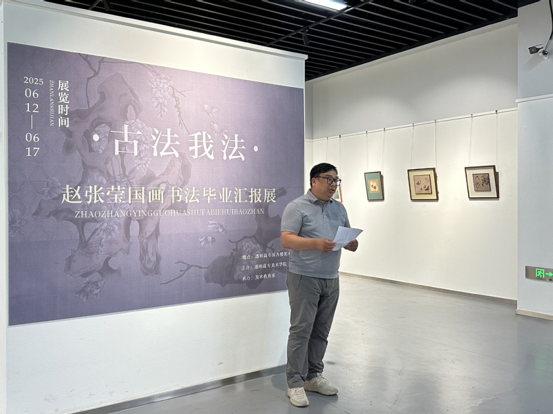 南通市美术家协会副主席、南通市书画院原经理邵连先生在致辞中深情回顾了他与通师的深厚渊源,同时对赵张莹的艺术探索给予了高度赞赏。他表示:“赵张莹同学的作品既展现了扎实的传统笔墨功底,又饱含当代青年的艺术思考,这种守正创新的艺术态度尤为可贵。”他勉励这位青年学子能永葆对艺术的赤诚之心,在传承与发展中国书画艺术的道路上继续深耕。
